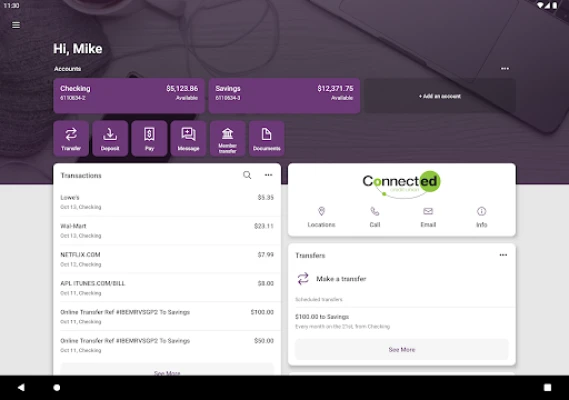 Connected Credit Union Mobile allows you to check balances, view transaction history, transfer funds, apply for a loan and pay loans on the go!
