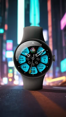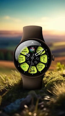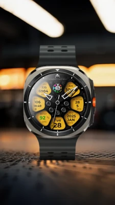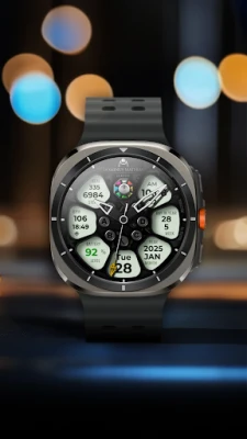 Fashionable and original watch face crafted by Dominus Mathias for Wear OS 3+. It combines huge amount of necessary information, including time (digital & analog), date (day in week, day in month, day in year, month, year), health metrics (steps, heart beat, calories) and battery level. Instead of this there is one customizable complication displaying sunset/sunrise data as initial.